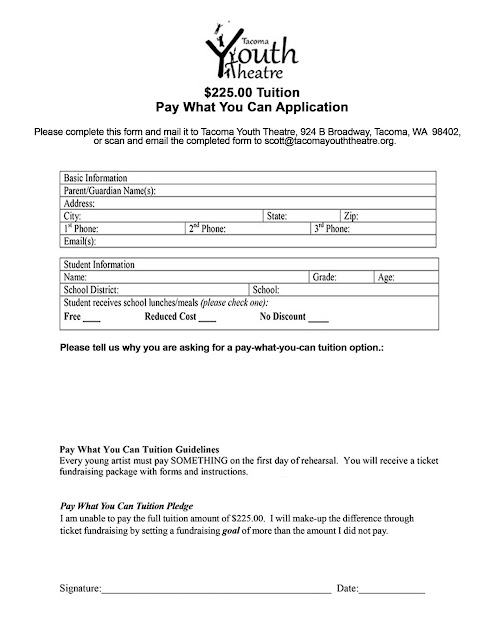 PWYC tuition gives families that qualify the option of paying what they can for tuition and making up the difference through our ticket sale fundraiser for that show. Every child must pay something in order to register.